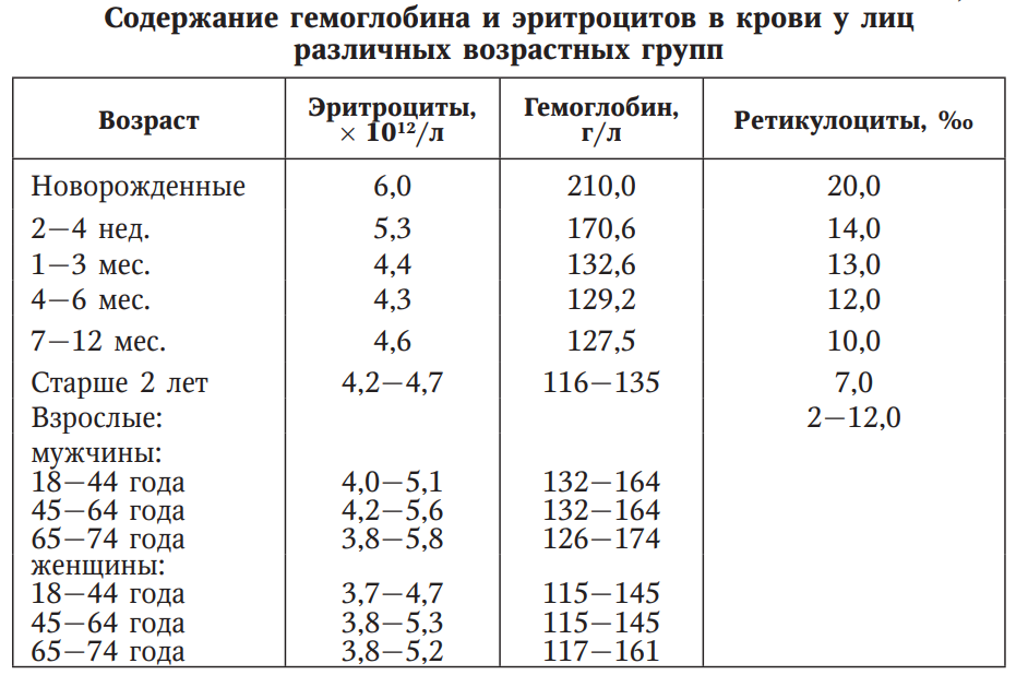 В таблице представлена норма содержания эритроцитов (красные кровяные клетки) и гемоглобина в крови.