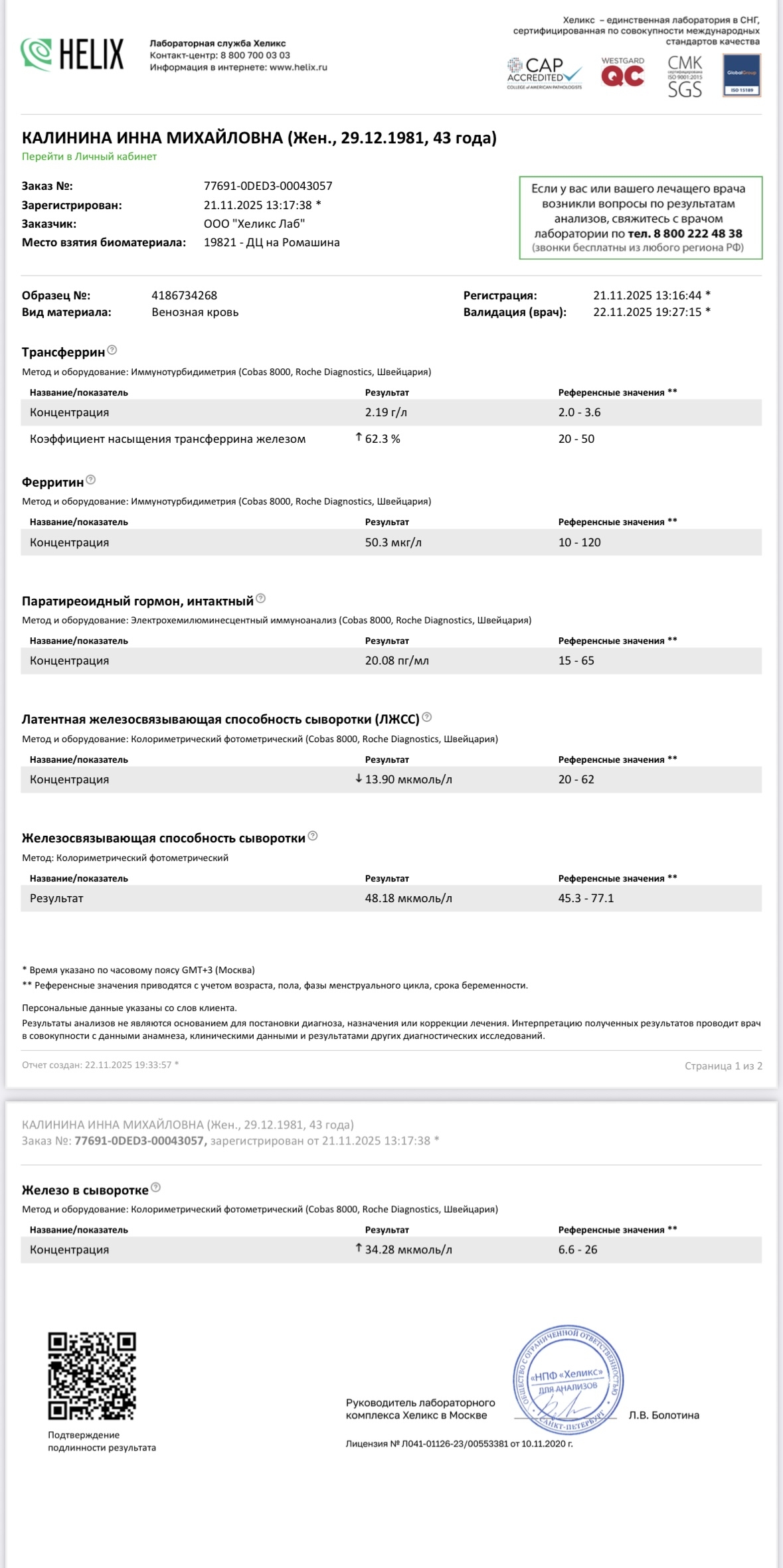 Уважаемые доктора! Скажите пожалуйста, о чём говорят эти показатели железа и паратгормона? Какие мои дальнейшие действия? Заранее благодарю.